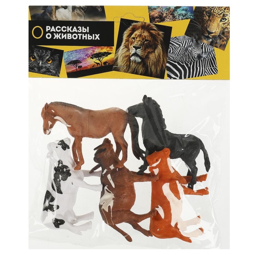 Игрушки серии «Рассказы о животных» – копии реальных зверей, птиц, рептилий и насекомых. Благодаря таким игрушкам, можно легко и весело познакомить ребёнка с представителями животного мира, их повадками и особенностями. Пластизолевыми игрушками можно играть на улице и в ванной, они легко моются. В набор входят: корова – 9,5 см, бык – 9,5 см, лошадь – 10 см, осёл – 9 см, белая корова – 9,5 см.