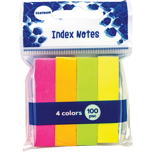 Клейкие листки - индексы Centrum позволят быстро выделить нужную информацию на любом бумажном носителе или использовать их в качестве пометок и указателей. При нанесении записей могут использоваться любые письменные принадлежности. Индексы представляют собой бумагу небольшого размера с клеевым краем. Предназначенные для маркировки любой поверхности, они не оставляют следов клея после удаления, а также подходят для многократного переклеивания. В наборе 4 разноцветных блока по 100 листов. Размер блока: 50*12 мм.
