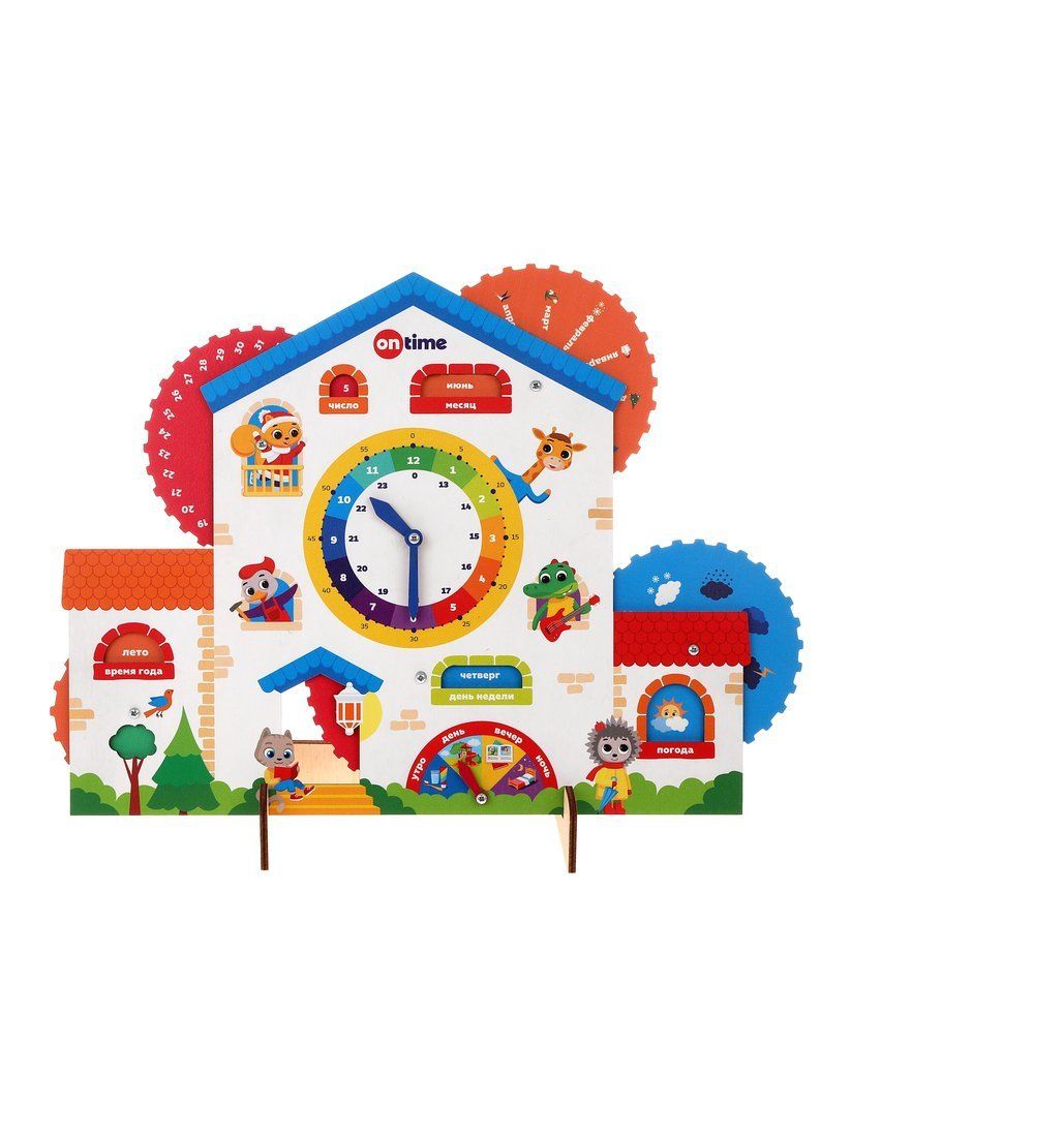 Многофункциональная развивающая игрушка представляет собой красочный деревянный планшет с подвижными стрелками и шестеренками. Планшет разделен на несколько тематических зон с «окошками». Вращайте пять шестеренок и выбирайте в «окошке» время года, число, месяц, день недели и погодные условия. Поворачивайте стрелочки и указывайте минуты и часы, время суток.