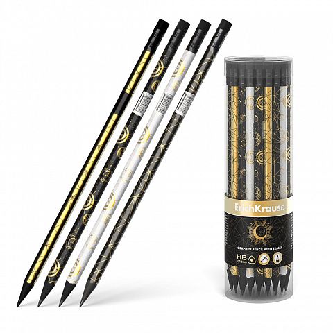 Эргономичный трехгранный чернографитный карандаш из отборной древесины с ластиком, твердость НВ. Четыре дизайна корпуса карандаша с фольгированными элементами, черное дерево, ластик черного цвета. Специальная пропитка древесины и сплошная проклейка грифеля обеспечивает высокую ударопрочность. Мягкая древесина и идеальная центровка грифеля гарантируют легкую заточку с экономным расходом карандаша. Грифель диаметром 2.2 мм не царапает бумагу и не крошится. Ластик карандаша средней жесткости изготовлен из экологически чистого и гипоаллергенного материала термопластичной резины (TPR). Не содержит ПВХ. Длина 188 мм.