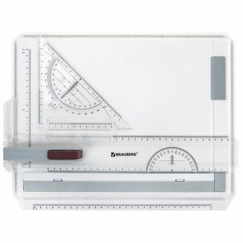 Доска размером 37х29,5 см изготовлена из пластика высокой прочности. Имеет антискользящие резиновые ножки, встроенный транспортир, две измерительные шкалы, дополнительный зажим для фиксации угла листа бумаги, подставки для размещения доски под наклоном, а также рейсшину. Оснащена двойным механизмом с блокировкой и пазом для фиксации рейсшины с любой из 4 сторон.
