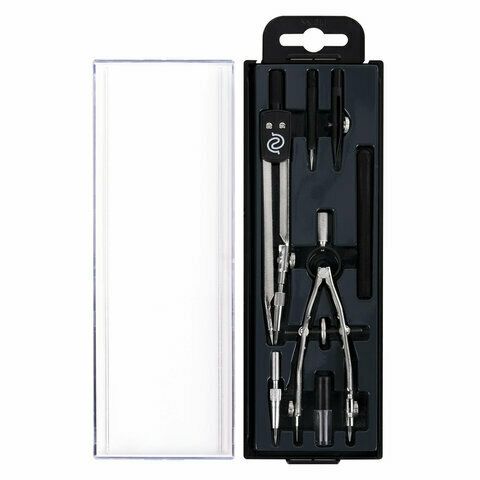 Готовальня, 7 предметов (циркуль 120 мм, игла, циркуль- трансформер 95 мм, циркуль- измеритель 120 мм, грифель для циркуля в футляре, насадка на рейсфедер, держатель для рейсфедера), пластиковая упаковка с подвесом