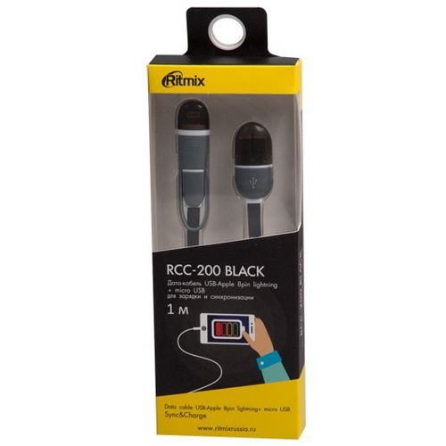Кабель RITMIX RCC-200, черный, USB 2.0 - USB-Apple 8pin lightning, Micro USB, защитные колпачки на коннекторах, 1 м.