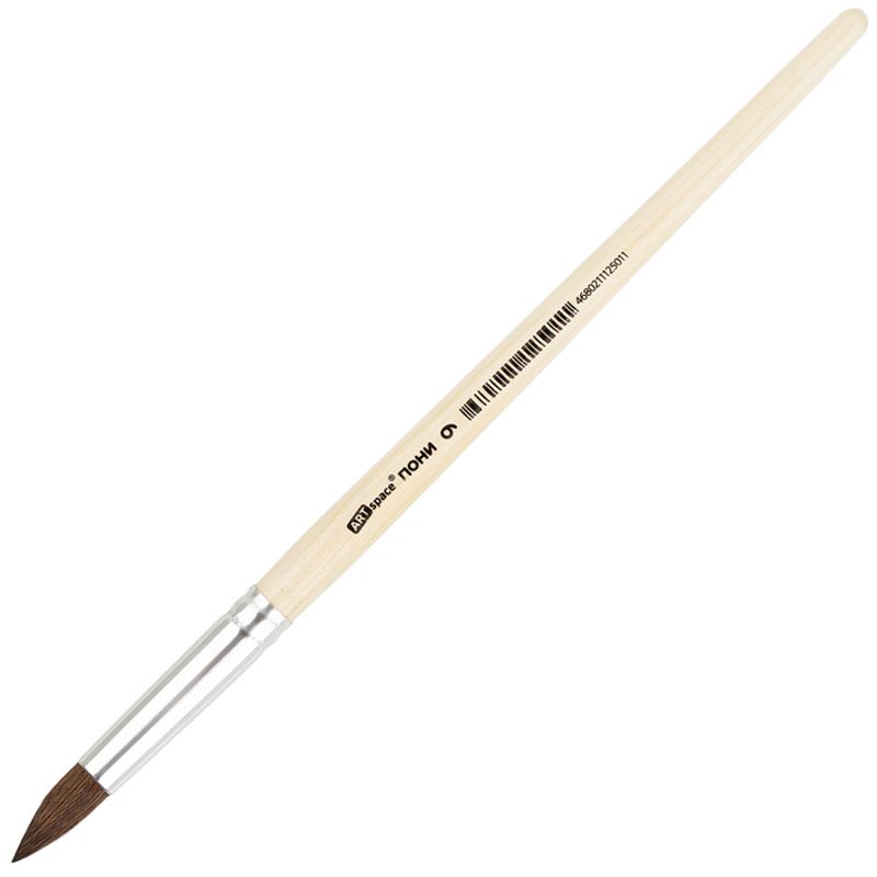 Художественные кисти ArtSpace изготовлены из волоса пони. Он несколько толще, чем у белки, расстояние между волосками больше, поэтому воду такая кисточка набирает меньше, чем из белки или колонка. Приобретают форму конуса, не слишком упруги. Кисть круглой формы с короткой ручкой из дерева идеальна для начинающих художников, поэтому её часто используют в детских образовательных учреждениях.