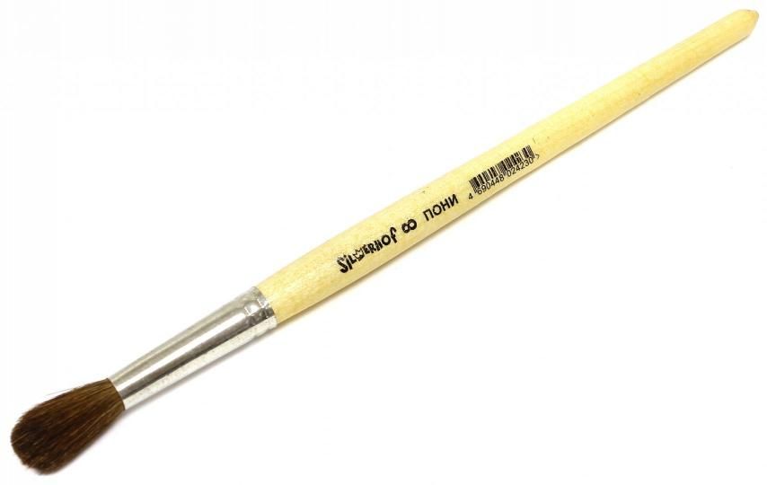 Художественные кисти ArtSpace изготовлены из волоса пони. Он несколько толще, чем у белки, расстояние между волосками больше, поэтому воду такая кисточка набирает меньше, чем из белки или колонка. Приобретают форму конуса, не слишком упруги. Кисть круглой формы с короткой ручкой из дерева идеальна для начинающих художников, поэтому её часто используют в детских образовательных учреждениях.