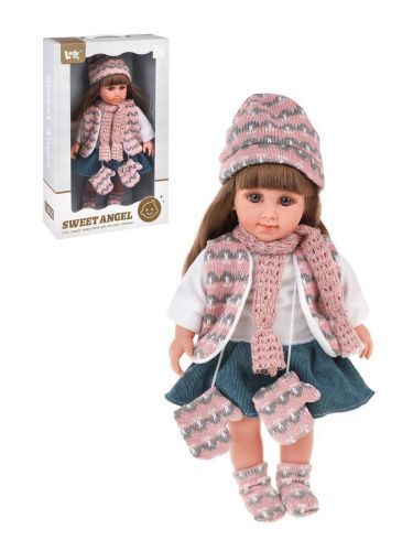 Куколка одета в платье с длинным рукавом (платье расстегивается и снимается, застежка на липучку), теплый вязаный жилет, вязаные носочки, шарф и шапочку. Пара рукавичек делает ее образ стильным и завершенным.