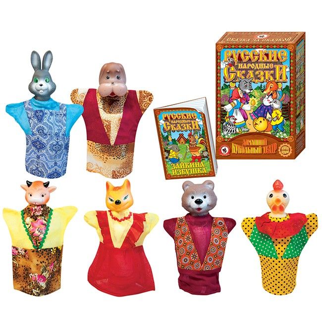 Кукольный театр – очень популярное среди детей занятие. Вместе с героями русских-народных сказок малыши учатся находить друзей, побеждать зло, дети становятся более общительными и дружелюбными. В набор кукольного театра «Зайкина избушка» входят 6 кукол-перчаток, изготовленных из высококачественных материалов: натурального текстиля и ПВХ пластизоля. А также книжка со сценарием к сказке в стихах и подробные рекомендации по подготовке к спектаклю. Игра для детей от 3 лет. Состав набора:• Куклы-перчатки – 6 шт. (заяц, собака, бык, лиса, медведь, петух) • Сценарий сказки