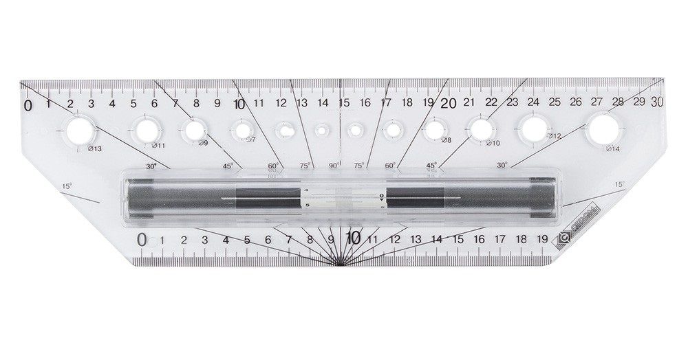 Чертежный инструмент в виде линейки с пластиковым роликом. Включает в себя транспортир и трафарет-отверстия.