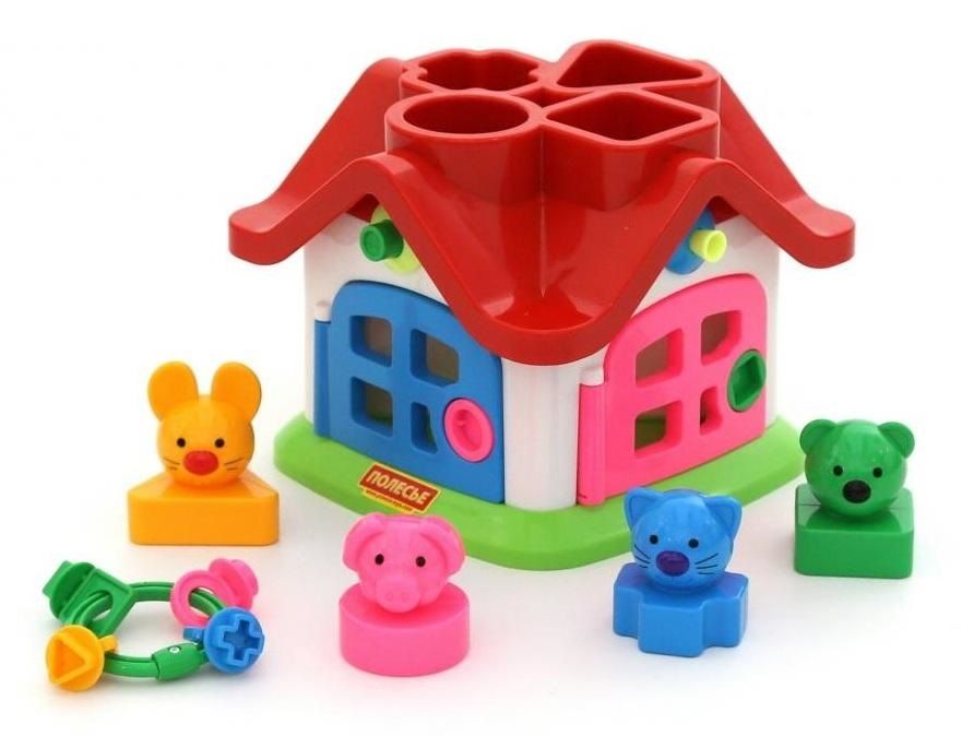 Яркий цветной красивый теремок с 4 дверками. У каждой двери свой замочек. Есть связка цветных ключей. Внутри дома перегородки - 4 комнаты. За каждой дверкой есть жилец: мишка, зайчик, кошка, поросенок. В дом они попадают через отверстия в крыше: сажаем их в дырочку, нажимаем на кнопочку (для каждого своя), зверек проскакивает в квартирку. По желанию можно и через дверку войти. Высота зверюшек 6 см. Основания у каждого зверя своей формы: у зайца в основе треугольник, у поросенка - кружок, у мишки - квадрат, у котенка - крест.