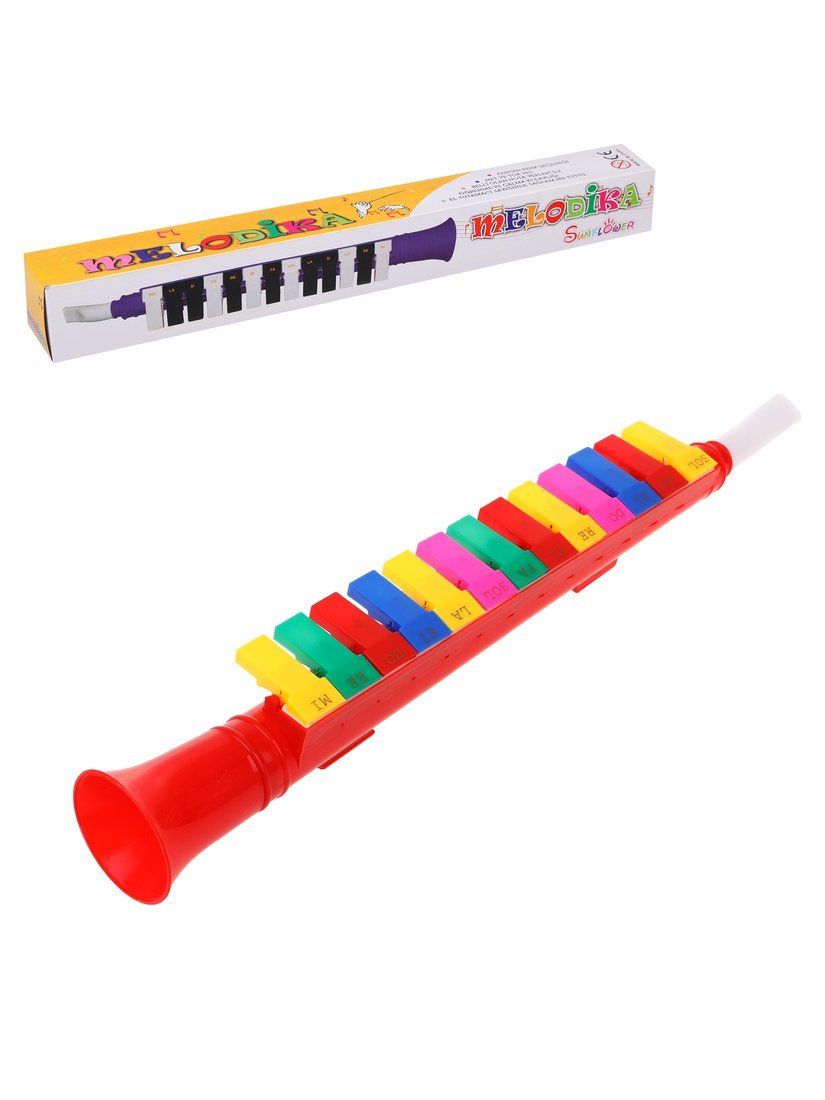 Яркая игрушечная мелодика адаптирована для самых маленьких: она имеет 13 клавиш, названия ноток подписаны. Чтобы сыграть свои собственные мелодии, нужно выдыхать воздух с определенной силой в специальное отверстие – мундштук – и при этом нажимать на клавиши.