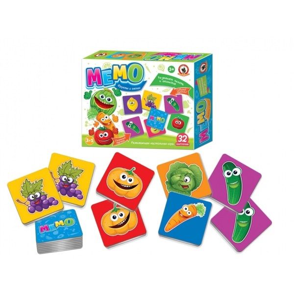 Развивающая настольная игра «Фрукты и овощи» из серии «Мемо» включает 32 карточки с красочными изображениями и правила. Играть в неё интересно и очень полезно для тренировки памяти и способности концентрировать внимание. Карточки выполнены из толстого картона, их будет удобно держать в ручках даже самым маленьким игрокам. В правилах описано несколько вариантов игры.