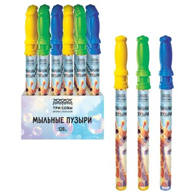 Флакон вытянутой формы объемом 120 мл дополнен удобной для держания и яркой рукояткой. Вытянутая форма палочки с несколькими отверстиями позволяет легко надуть целый каскад разноцветных мыльных пузырей.