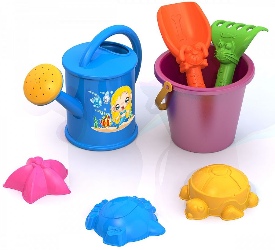 Набор включает необходимые инструменты для игры с песком, такие как грабельки, совочек, ведерко и лейку.