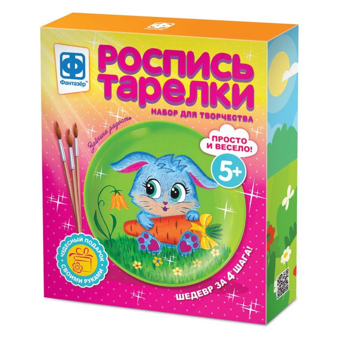 В наборе: пластиковая тарелка, краски, кисть, наклейка-раскраска, инструкция.