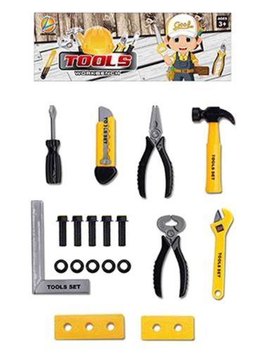 Набор инструментов всегда пригодится в хозяйстве юному мастеру. С ним ребёнок наравне с папой может прибивать гвозди, откручивать гайки и пробовать свои силы в строительном деле! В комплекте 19 предметов: пассатижи, плоскогубцы, молоточек, гаечный ключ, строительный ножик, строительный угольник, 5 болтов, 5 гаек, отвертка, 2 прямоугольных элемента, имитирующих древесину. Предметы набора изготовлены из полимерных материалов. Рекомендованный возраст: 3 года +