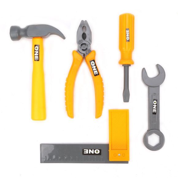 Набор инструментов предназначен для сюжетно-ролевых игр, способствующих развитию ребёнка. В комплекте - 5 предметов, среди которых мальчик найдёт плоскогубцы, угольник, молоточек, гаечный ключ и плоскую отвёртку.