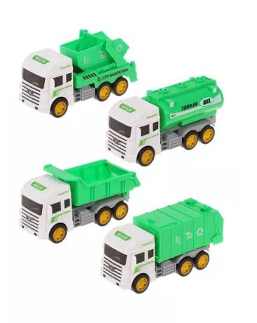 Набор включает в себя 4 машины серии «Строительная и спецтехника» с инерционным механизмом движения: бензовоз, 2 мусоровоза, грузовую машину.