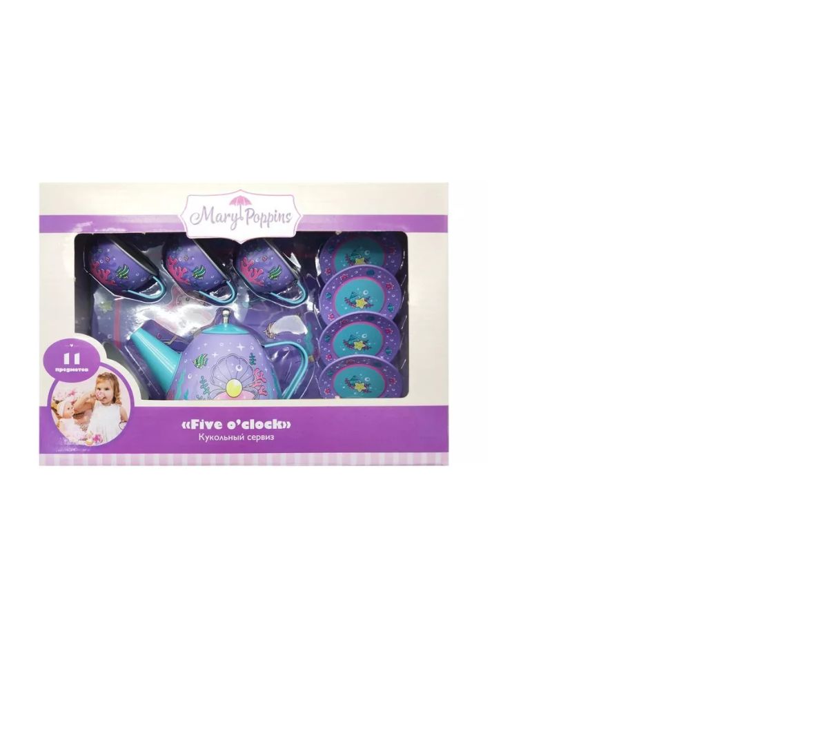 Кукольный сервиз «Русалка» включает 11 предметов: чайник, крышку, поднос, 4 чашки, 4 блюдца.