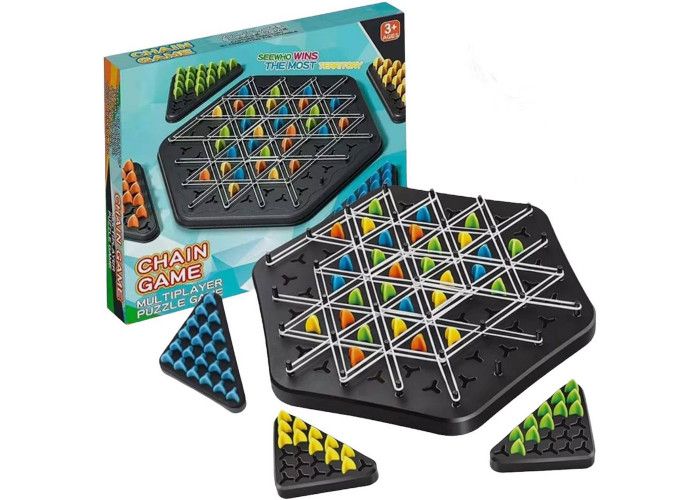 Настольная игра Треугольники способствует развитию координации, логического мышления и концентрации внимания у ребёнка. Цель игры - располагать резинки на игровом поле, образвывая треугольники. При образовании данной фигуры - ставим фишку. Выигрывает игрок, первый, разметивший все фишки на игровом поле.