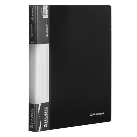 На корешке имеется карман для маркировки содержимого. Папка изготовлена из качественного пластика толщиной 0,6 мм с антибликовой фактурой, а ширина корешка составляет 20 мм. Содержит 30 вкладышей