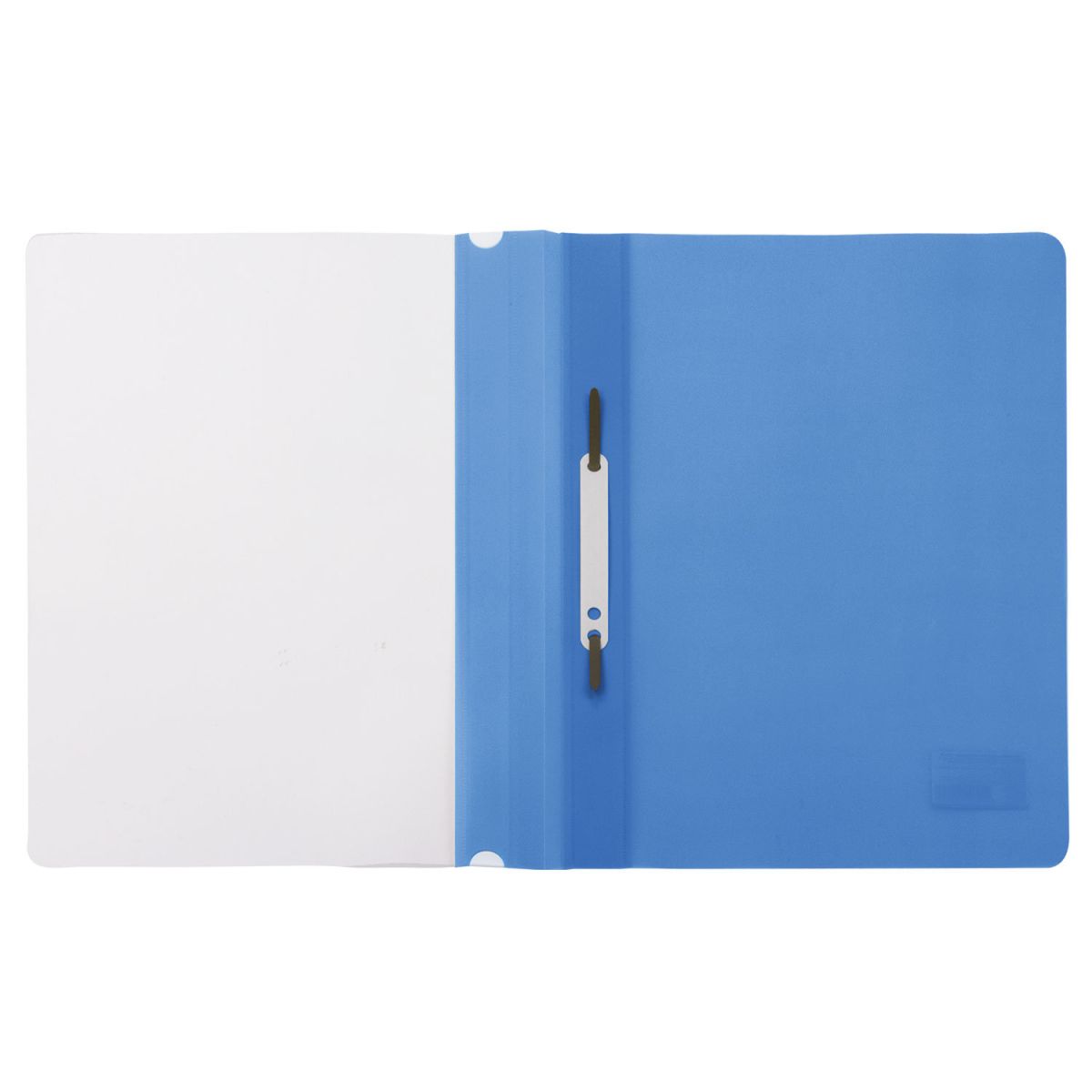Фиксирует до 100 листов формата А4. Толщина пластика верхнего листа составляет 130 мкм, а нижнего - 180 мкм. Предельно простой механизм подшивки: металлические усики и пластиковая планка для надежной фиксации документов. Скоросшиватель изготовлен из качественного полипропилена. Прозрачный верхний лист позволяет определить содержимое, не открывая скоросшиватель, который к тому же снабжен сменным пластиковым корешком, что дает возможность структурировать информацию. Благодаря фактуре "песок" и яркому голубому цвету обложки папка никогда не затеряется на полке.