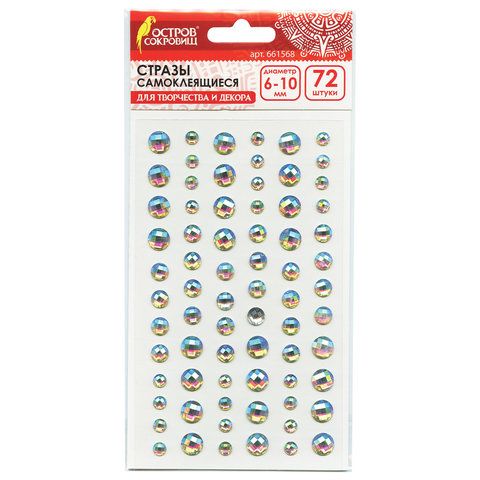Качественный клеевой слой обеспечит надежную фиксацию на любых поверхностях. Легко отделяются от подложки. Изготовлены из пластика на основе акрила. Стразы представлены в трех размерах: диаметром 6, 8 и 10 мм. Имеют кристаллическую форму и выполнены в завораживающем под "серебро" цвете. Предназначены для детей от 3 лет. Поставляются в пакете с европодвесом. В упаковке - 72 стразы, размер ассорти. Общий вес - 100 г.