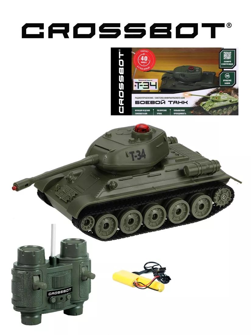 Радиоуправляемая модель танка Т-34 (СССР) с реалистичными звуковыми и световыми эффектами при стрельбе и визуальными эффектами (отдача при выстреле) выполнена в масштабе 1:32. Танк осуществляет движение вперёд и назад, поворачивает вправо и влево, преодолевает подъёмы под углом 45°. Также игрушка совершает круговое вращение на месте и поворот башни вправо-влево на 320°. При покупке второго танка масштаба 1:32 ТМ "Пламенный мотор" и"CROSSBOT" вы получаете возможность командной игры в Танковый бой. 2 игрока.